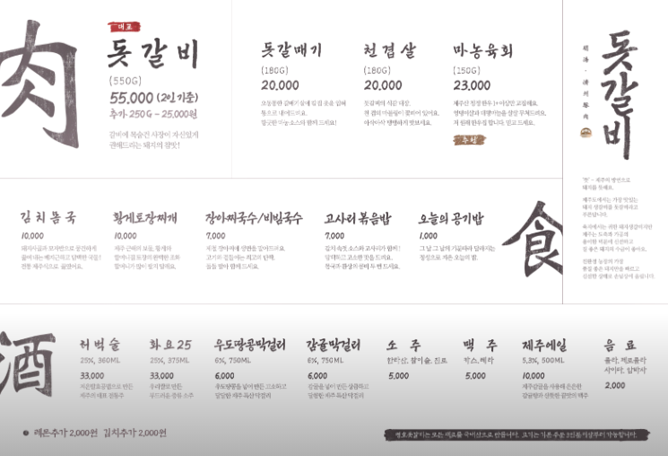 대표 메뉴 : 돗갈비, 돗갈매기, 천겹살, 마농육회, 김치몸국, 황게 토장찌게 등